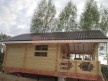 Проект одноэтажной бани №128 сам по себе довольно прост: есть туалет и мойка, традиционная парная и комната отдыха. Также есть довольно большое помещение под спальню или бильярдную. Типично финская особенность — большая терраса с красивой поперечной перекладиной под общей крышей.