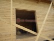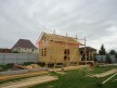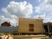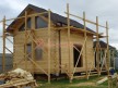 На фото можно проследить основные этапы строительства и итог: готовый сруб из клееного бруса под крышу 5х7,5 с мансардой. Окна и дверной проекм закрыты пленкой на зиму.