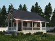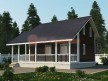 Это полноценный полутораэтажный проект с утепленной жилой мансардой. Можно использовать в качестве гостевого домика круглый год. Крыша двускатная, асимметричная накрывает большую открытую террасу во всю длину бани. Со стороны фасада — небольшое крыльцо под козырьком.