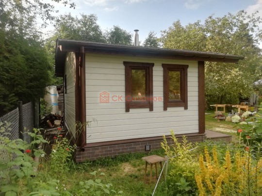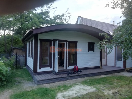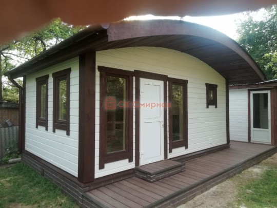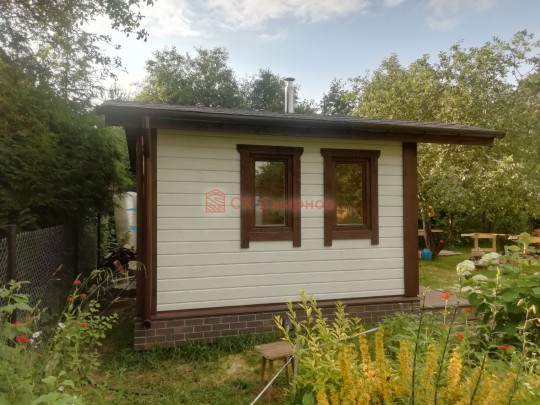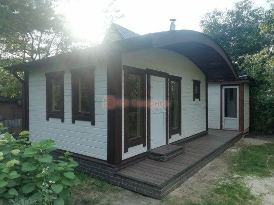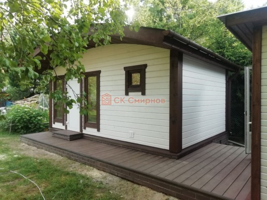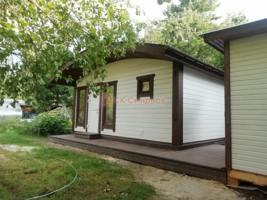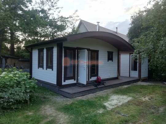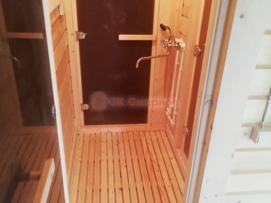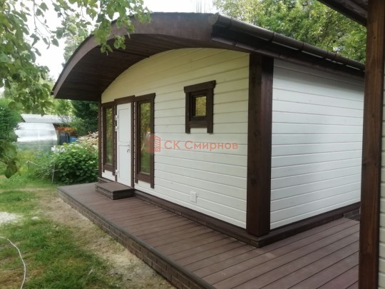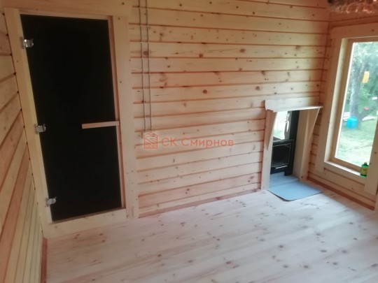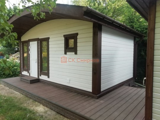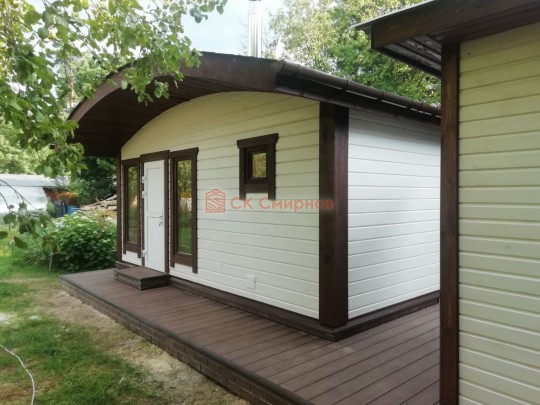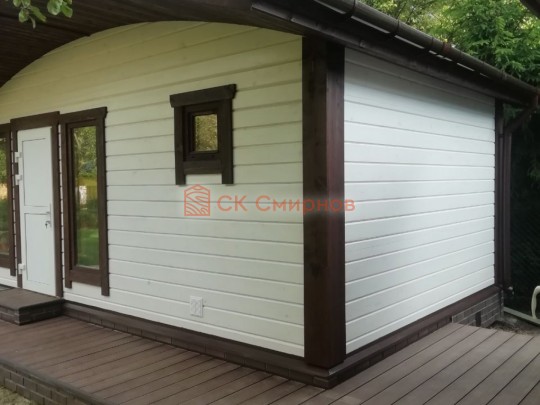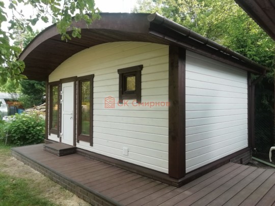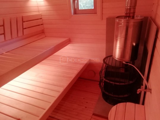 Для строительства красивой бани 3.5х5.3 метров СК Смирнов разработал проект №289 с обустроенной парной и комнатой отдыха. По планировке общая площадь составляет 18.5 квадратных метров. Можно выделить несколько особенностей проекта: терраса, санузел, панорамные окна. Мы строим бани под ключ с полной отделкой снаружи и внутри.