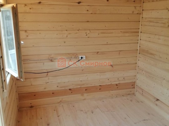 Из профилированного сухого бруса 9х14см, 14х14 см или 14х19 см. Сборка сруба в теплый угол на нагеля или гвозди 200 мм со сверлением отверстия в верхнем брусе (в зависимости от вида бруса).