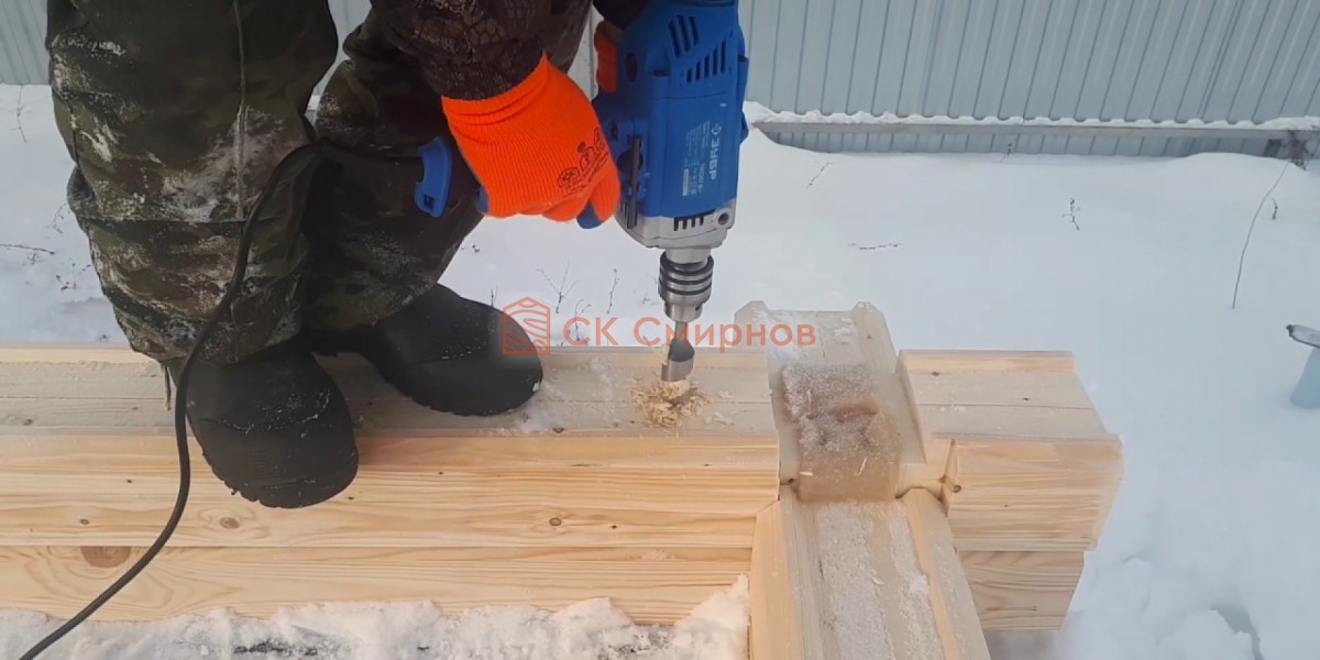 Еще 50% зависит от опыта мастеров. Наши бригады собирают сруб на металлические гвозди с обязательным сверлением в верхнем бруске. Это нужно для того, чтобы брус мог свободно двигаться по гвоздю во время усушки. Ситуации с «зависанием» брусьев не будет, а значит не будет и щелей. Такая технология отнимает у мастеров много времени — да, срок строительства и цена немного выше, чем в других компаниях, однако и качество гораздо выше.