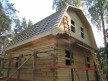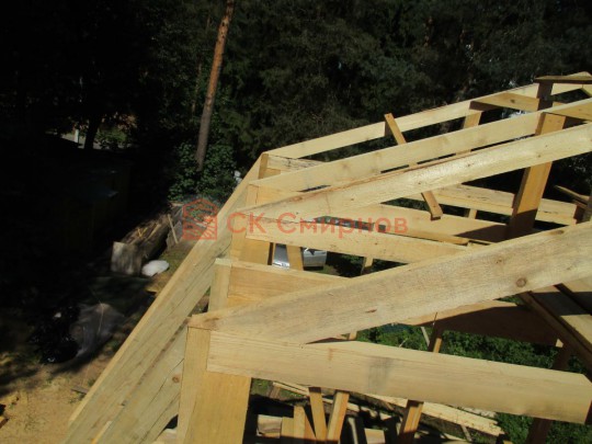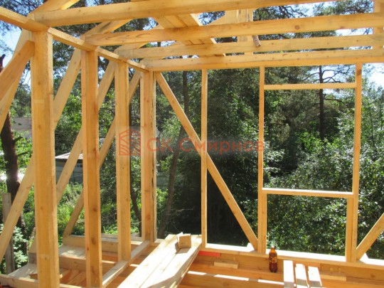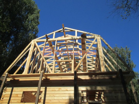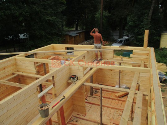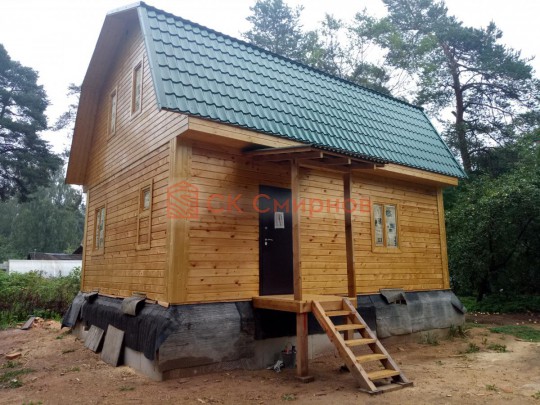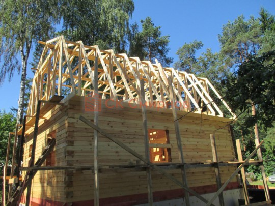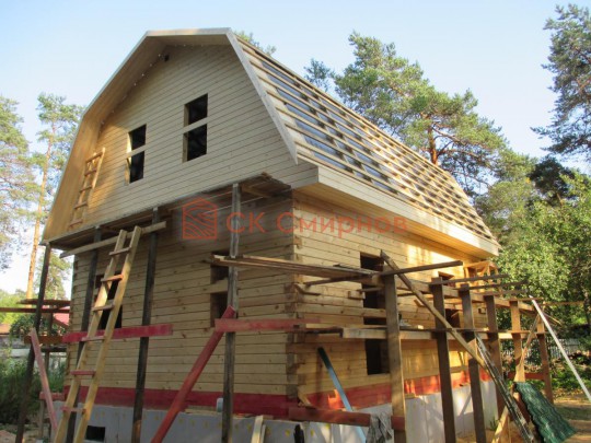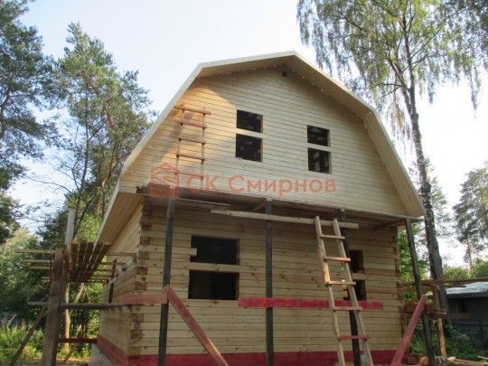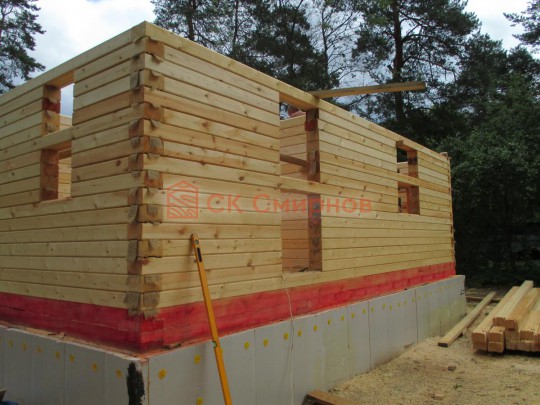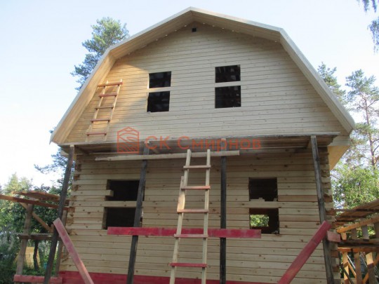 Из профилированного сухого бруса 9х14см, 14х14 см или 14х19 см. Сборка сруба в теплый угол на нагеля или гвозди 200 мм со сверлением отверстия в верхнем брусе (в зависимости от вида бруса).