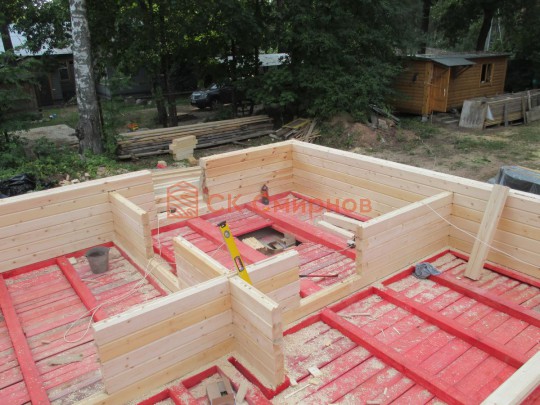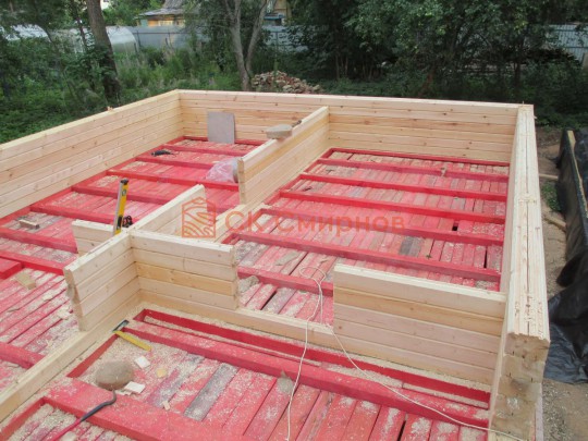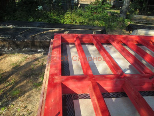 Лаги, обвязку и черновой пол обрабатываем раствором био огне защитой ( зимой оговариваются отдельные условия ), в основном красный цвет, но может быть и бесцветная обработка.