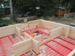 Главная проблема брусовых домов — усадка, после которой в срубе возникают щели в палец толщиной. Так случается, когда строят из дешёвого сырого бруса, плотно сажая венцы на гвозди (деревянные или металлические — без разницы). Мы же тратим время на сборку со сверлением. То есть сажаем брусья на металлические гвозди и в верхнем венце высверливаем отверстие под каждую шляпку. Поэтому во время усадки бруски не зависают на гвоздях, деформируя сруб, а свободно по ним скользят. Технология трудо- и времязатратная, но результат потрясающий — даже в срубах из сырого бруса практически нет щелей.
