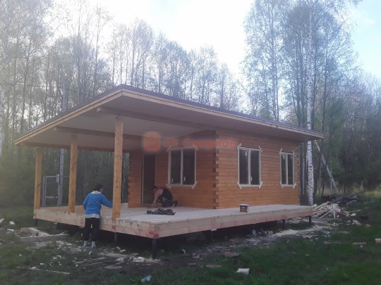Из профилированного сухого бруса 9х14см, 14х14 см или 14х19 см. Сборка сруба в теплый угол на нагеля или гвозди 200 мм со сверлением отверстия в верхнем брусе (в зависимости от вида бруса).