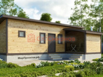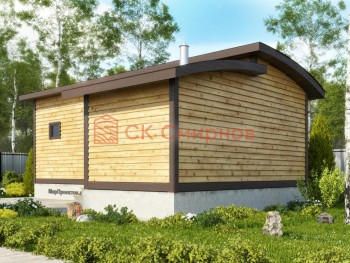 Каркасная технология замечательна тем, что позволяет реализовать самые изысканные по геометрии проекты. Проект бани №132 по-настоящему красив и опрятен. Он разделен на две функциональные части: банные помещения и беседку-террасу в форме эркера. Общая площадь составляет 28 кв.м.