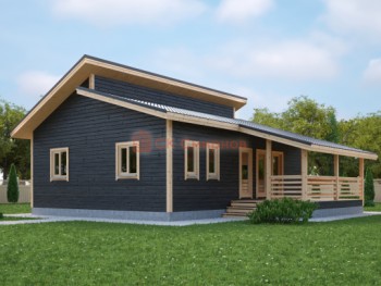Этот дом можно построить по каркасной и каркасно-щитовой технологии. Варианты наружной отделки на выбор клиента — это может быть имитация бруса, сайдинг, блокхауз, вентиллируемые панели.