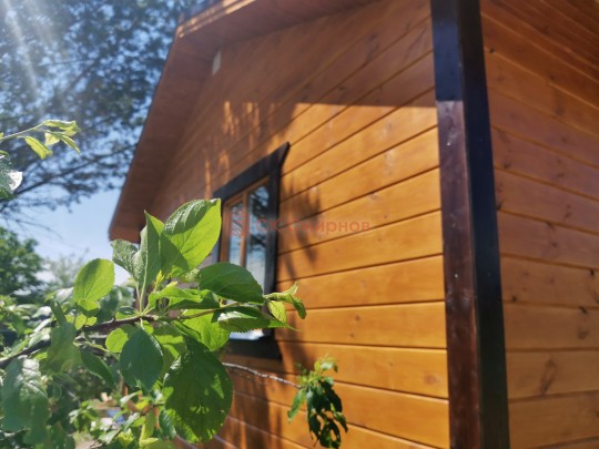 Покрашен домик защитным составом Pinotex «Орегон» + обводка «Палисандр».